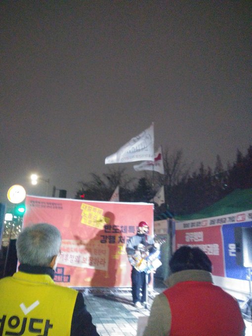 공연 및 자유발언, 3당 대표 및 부대표의 연설이 끝나고 세종호텔까지 행진했다. 난 늘 혼자 움직이는 스타일이었지만 역시 깃발들과 함께 행진하니 흥이 나긴 했다. 부당 해직자 대표 고진수님의 고공농성 현장까지 와서 인사.