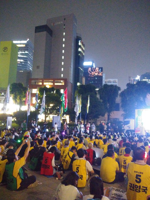 6시에 퇴근해서 도착해 보니 7시 반 정도. 권영국 후보는 한화 농성장에서 여기로 이동 중이라서(...선거 유세를 빙자한 투쟁 현장 방문이다) 근처에서 담배 한 대 피우고 어슬렁대며 좀 시간 죽임.